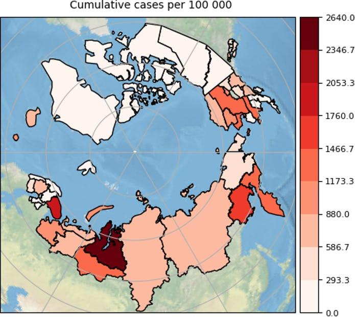 3. As of 15 September 2020, Murmansk Oblast has 238 deaths per million and 13,911 cases, Arkhangelsk Oblast has 234 deaths per million, Krasnoyarsk Krai has 180 deaths per million and the Yamalo-Nenets Autonomous Okrug has 174 deaths per million and 25,611 cases per million. Finland has 8,750 cases, and Norway has 12,393 cases. Stop Coronavirus (2020) Operational data, https://стопкоронавирус.рф/. Accessed 15 September 2020.
