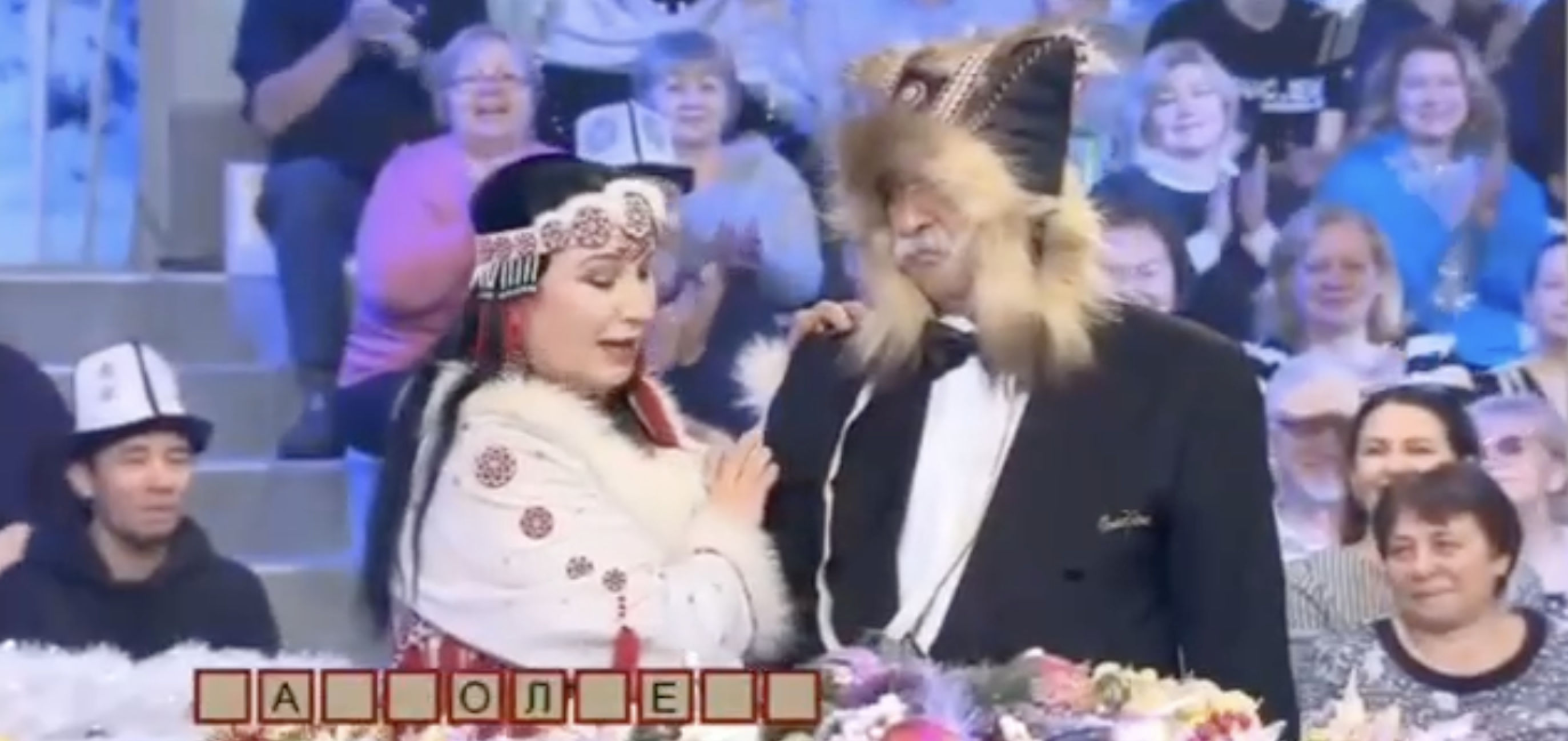 Лидия Кручинина вместе с Андреем Кукуном показала национальный танец, а затем подарила Леониду Якубовичу национальную шапку малахай и бусы из корюшки. Примерив шапку и бусы, ведущий пошутил, что выглядит глупо. У него произошел следующий диалог с гостьей:
