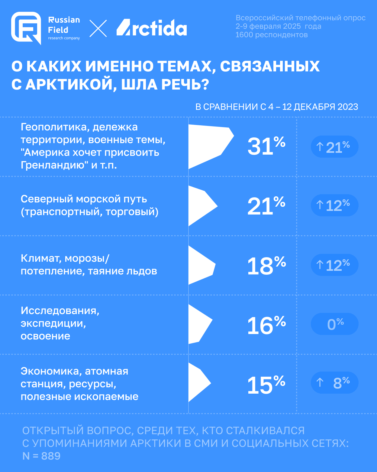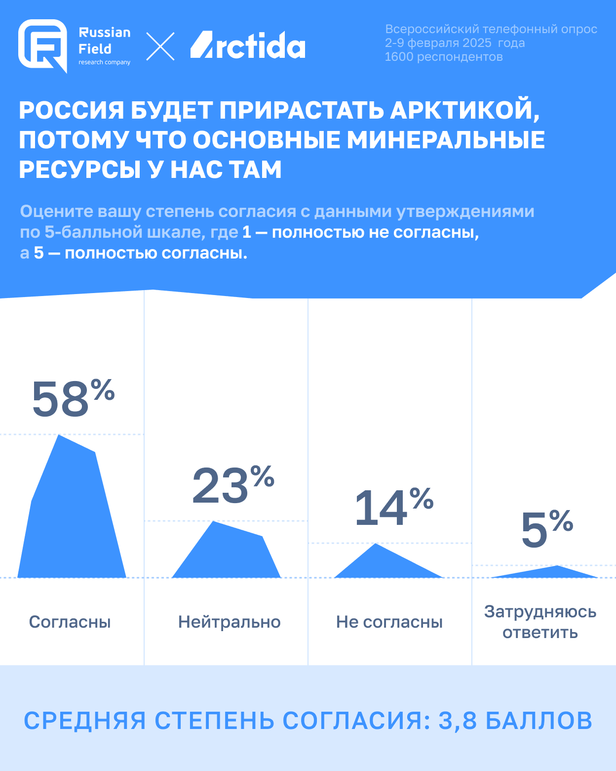 В 2024 году на Петербургском экономическом форуме Президент Путин заявил, что «Россия будет прирастать и Арктикой, потому что основные минеральные ресурсы у нас там» — с ним согласны 58% опрошенных. Согласно опросу, наиболее чувствительны к такой риторике люди старше 60 лет, не имеющие высшего образования, а также разделяющие милитаристские настроения.
