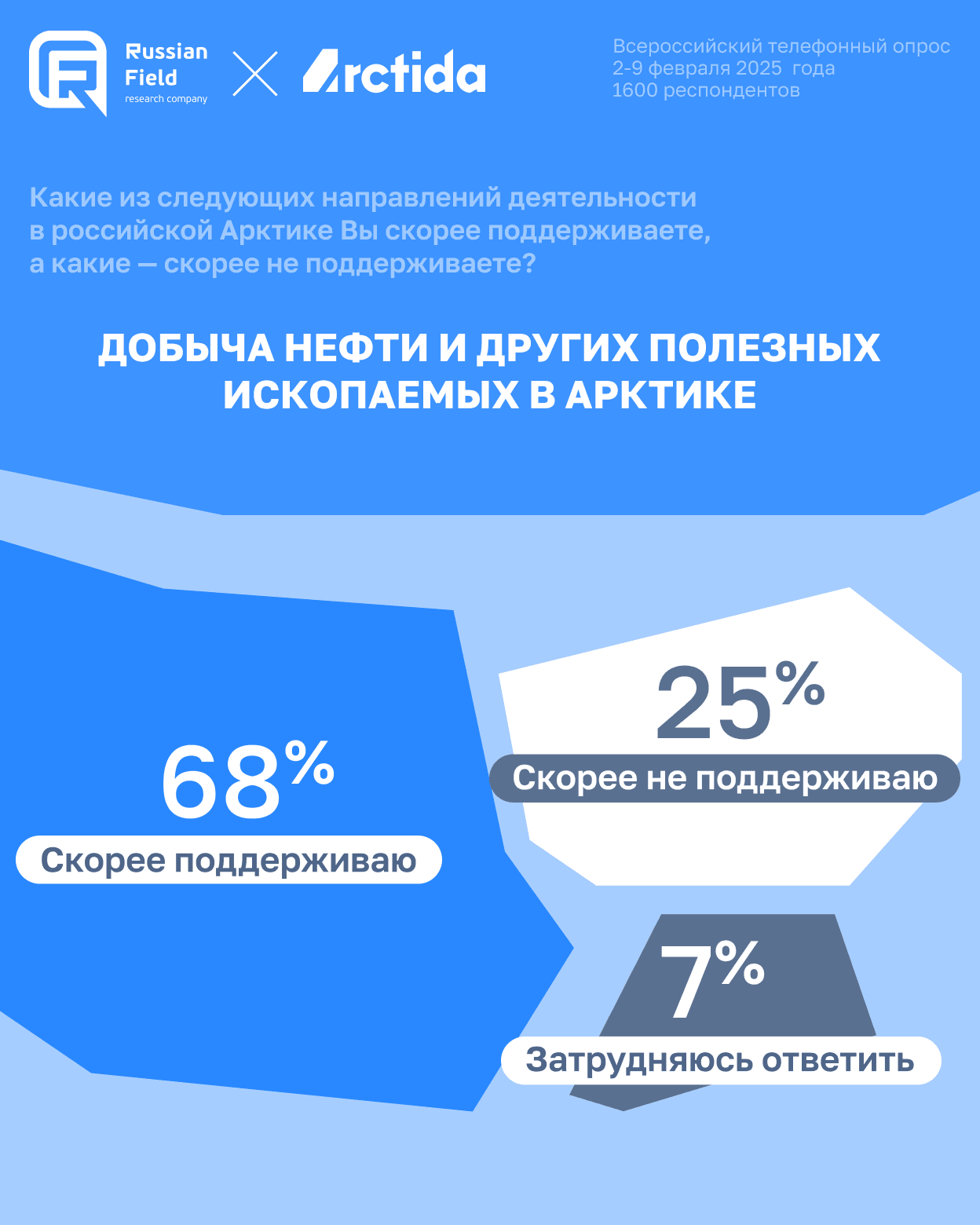 При этом большинство респондентов (68%) по-прежнему поддерживают добычу нефти и газа в Арктике. Однако на фоне экологических инцидентов, таких как разлив нефтепродуктов, число противников добычи постепенно растёт — с 21% до 25% за полтора года.