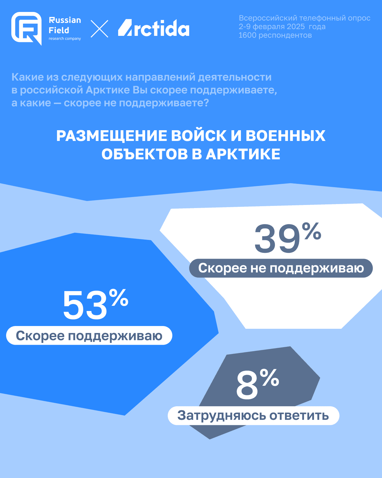 Доля россиян, выступающих против размещения войск и военных объектов в Арктике, выросла на 4% по сравнению с декабрём 2023 года и достигла 39%. При этом количество опрошенных, одобряющих милитаризацию в Арктическом регионе, осталось на прежнем уровне — 53%. Разумеется, за военное присутствие выступают чаще те, кто не стал бы отменять СВО в прошлом.