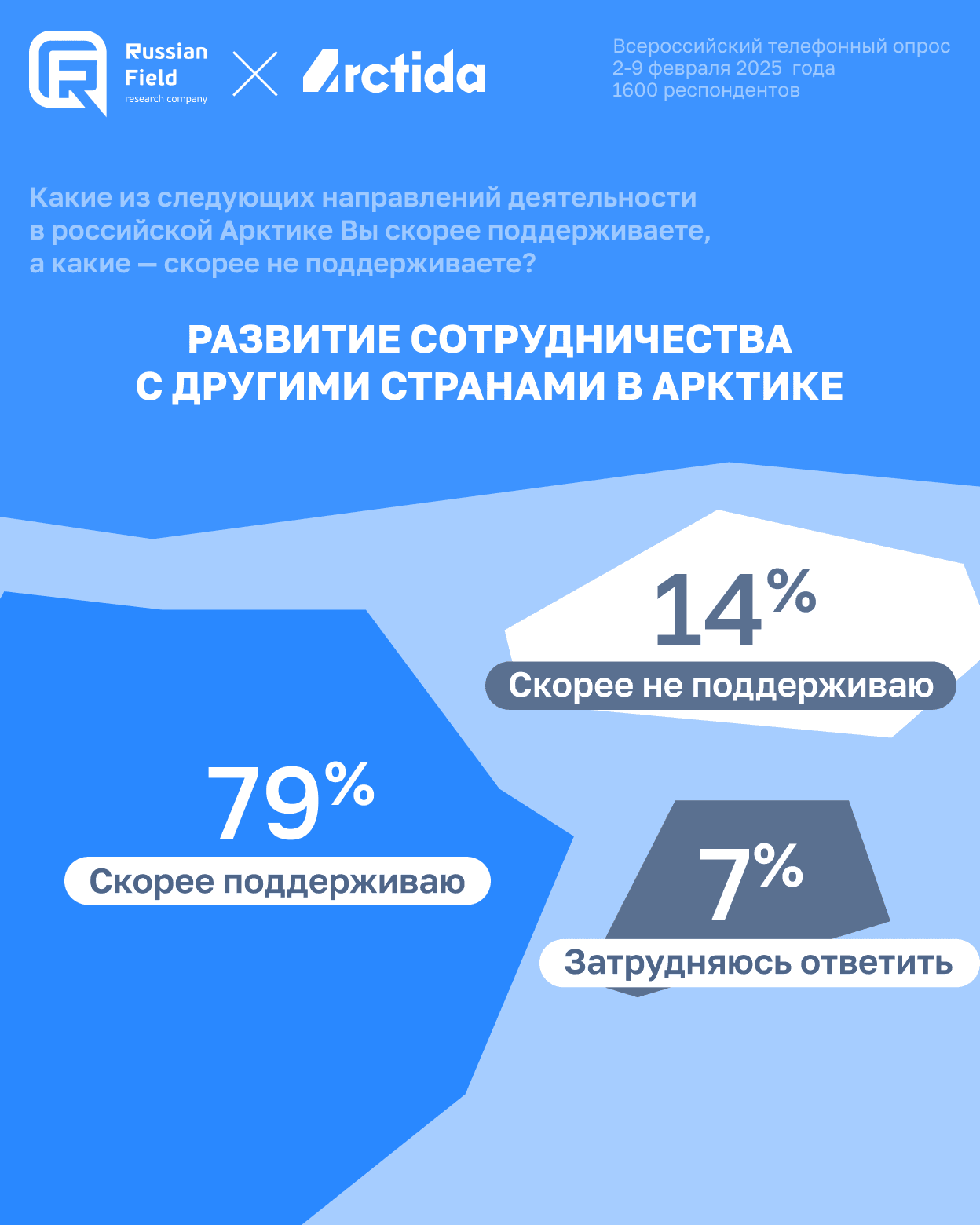 Более половины россиян (55%) считают, что Арктика сегодня — это территория диалога, стабильности и конструктивного сотрудничества, а 79% респондентов поддерживают развитие сотрудничества с другими странами в Арктике. Причем доля поддерживающих значимо возросла (на 10%) в сравнении с результатом прошлого опроса.