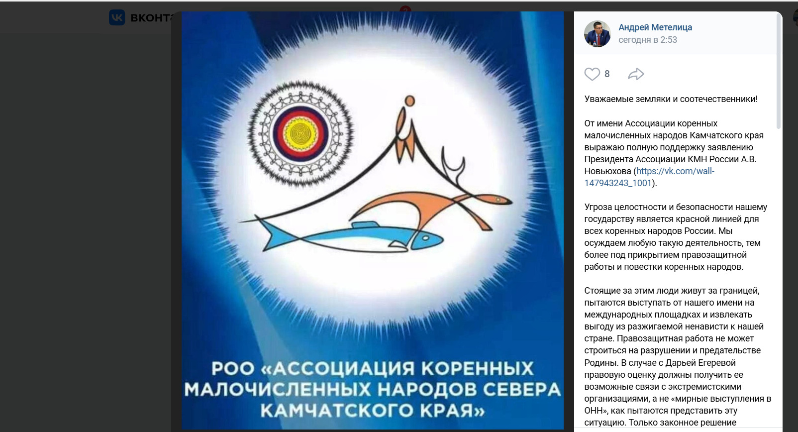Ответ на обращение председателя Ассоциации КМНС Камчатского края Андрея Метелицы в связи с арестом Дарьи Егеревой.